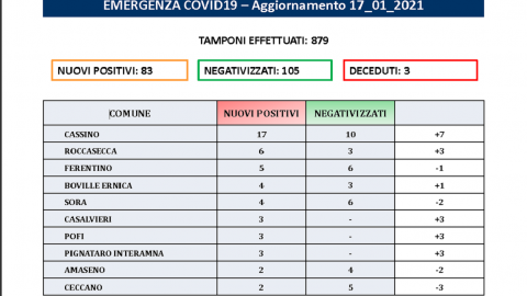 FROSINONE – 17 GEN – Sono 83 i nuovi casi in provincia di Frosinone nelle ultime 24 ore su 879