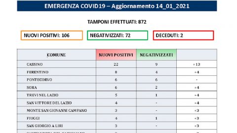 Coronavirus – Si rialza il tasso di positività in Ciociaria. Ci sono 106 casi su 872 tamponi