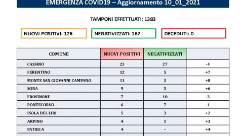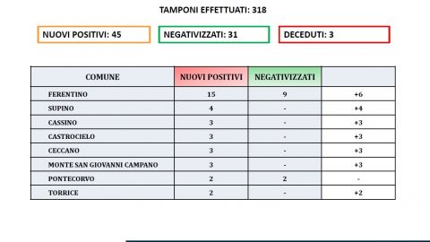 Come ogni lunedì i numeri in provincia di Frosinone sono in calo, merito però dei pochi tamponi effettuati, considerando anche