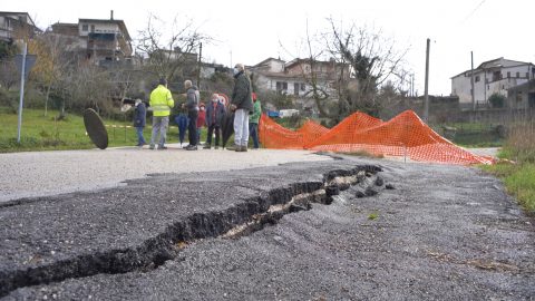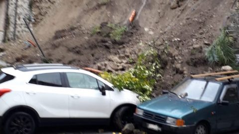 Un muro di contenimento che cede, con una frana che investe alcune autovetture parcheggiate lì sotto, in uno spiazzale. È