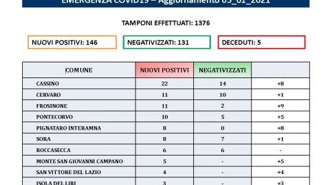 146 positivi su 1376 tamponi eseguiti, ma si contano purtroppo ben cinque decessi. Sono i numeri dell’ultimo bollettino della Asl