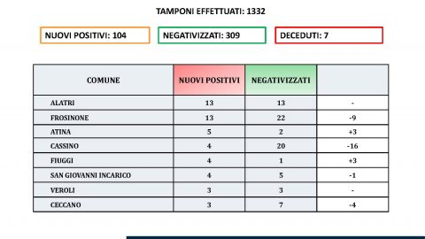 Il numero dei contagi da Covid in provincia di Frosinone nelle ultime 24 ore è pari a 104 nuovi casi
