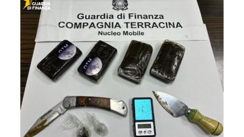 Quasi mezzo chilo di hashish, un bilancino di precisione, materiale per il confezionamento e due armi da taglio. È il