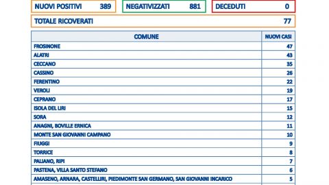 Zero decessi e 389 nuovi casi positivi in provincia di Frosinone. Il tasso di positività sale al 17,2% a fronte
