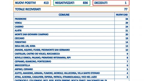 Continua il calo dei casi in provincia di Frosinone: sono 413 emersi su 2.851 tamponi, il tasso di positività scende