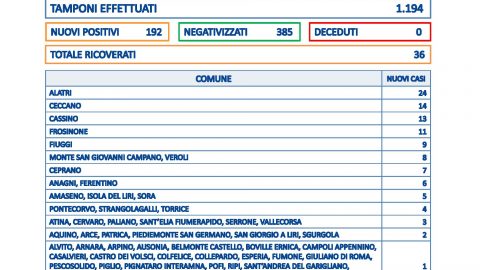 FROSINONE – 30 OTT – Sono 192 i nuovi casi in provincia di Frosinone su 1.194 tamponi processati, non risultano
