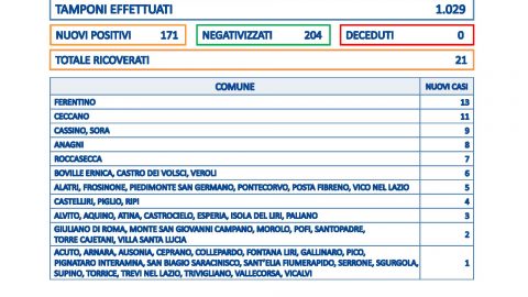FROSINONE – 15 SET – Sono 171 i nuovi casi in provincia di Frosinone su 1.029 tamponi processati. Non risultano