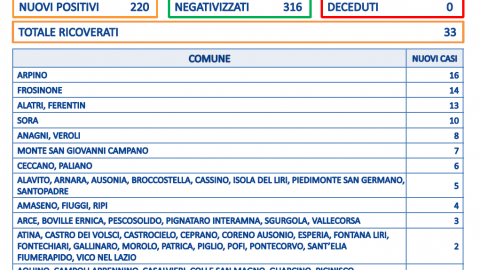 Sono 37 i nuovi positivi al Covid in provincia di Frosinone, dove si conta anche un decesso: si tratta di
