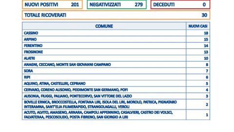 Frosinone – Sono 201 i nuovi positivi al covid in provincia di Frosinone, su 1.159 tamponi processati. Non risultano decessi,