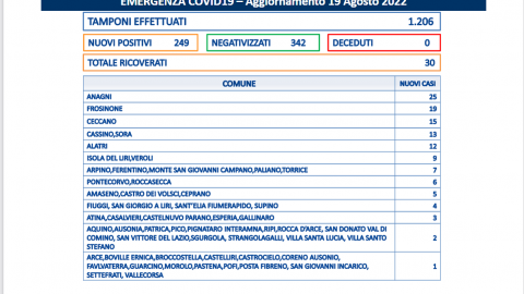 Covid – In Ciociaria tasso di positività al 20, 6%. 249 i casi. Scendono i ricoveri