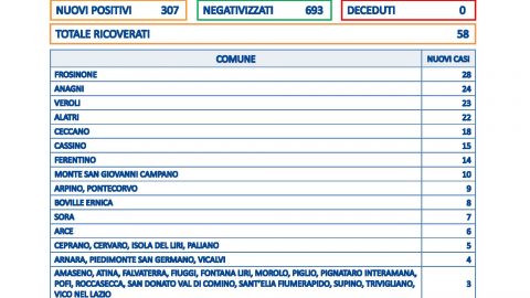 FROSINONE – Sono 307 i casi in provincia di Frosinone su 1770 tamponi processati, non risultano decessi. I guariti sono