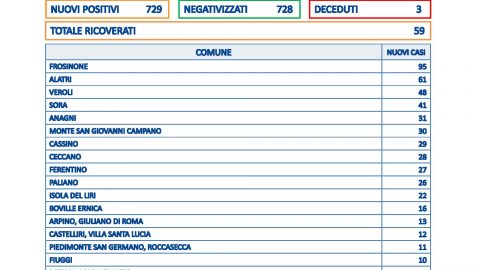 Sono 729 i nuovi casi positivi al Covid nelle ultime 24 ore in provincia di Frosinone. Il tasso di positività