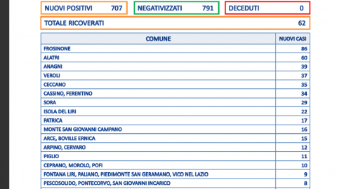 In provincia di Frosinone sono 712 i positivi emersi su 2870 tamponi, il tasso di positività è al 24,8%. C’è