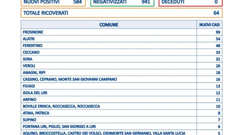 Sono 584 i nuovi positivi nel territorio della provincia di Frosinone, su un totale di 3545 tamponi processati. I guariti
