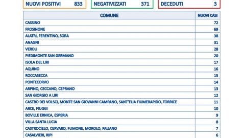 FROSINONE – 14 GEN – I nuovi positivi in provincia di Frosinone sono 833 su 5286. Il tasso di positività