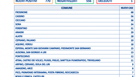 Sono 770 i nuovi positivi al Covid in Provincia di Frosinone. I tamponi processati sono stati 5116. Il rapporto è