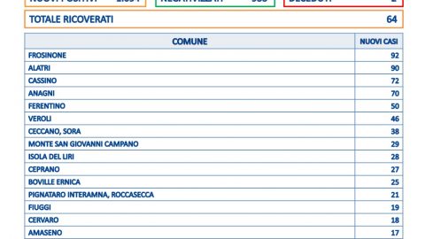 Salgono ancora i numeri dei contagiati in provincia di Frosinone: sono 1094 i nuovi casi su un totale di 4790