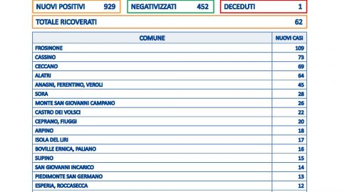 Frosinone – Sono 929 i nuovi casi in Provincia di Frosinone su 3.829 tamponi processati. Il tasso di positività resta