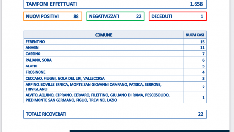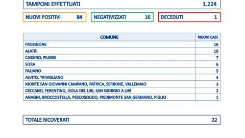 C’è un decesso in Ciociaria a causa del Covid. I casi positivi sono 84 su 1224 tamponi. Il rapporto è
