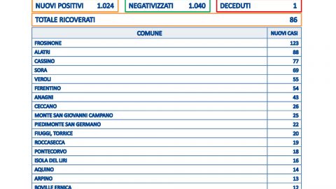 FROSINONE – 26 GEN – Sono 1024 i nuovi casi in Provincia di Frosinone su 5.857 tamponi processati. Il tasso