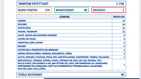 Continuano a salire i contagi in Ciociaria. Sono i 174 positivi su 1718 tamponi. E c’è anche una vittima. L’indice