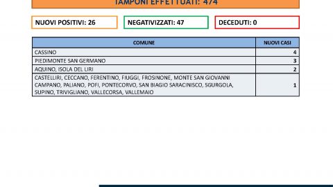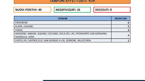 In provincia di Frosinone sono stati registrati 16 nuovi casi di positivi al Sars-CoV-2. I negativizzati sono due. Non ci