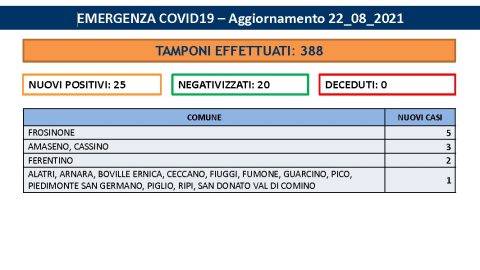 25 nuovi casi su 388 tamponi eseguiti, con un rapporto che scende al 6.4%. sono i nuovi contagi riportati nel