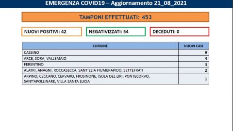 42 positivi in provincia di frosinone nell’ultimo bollettino: sono emersi da 453 tamponi eseguiti, con un rapporto che sale al