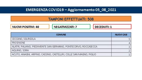 Nelle ultime 24h sono stati effettuati 508 tamponi nella provincia di Frosinone. Sono stati registrati 40 nuovi casi positivi, con