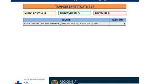 FROSINONE – 26 LUG – Nelle ultime 24h sono stati effettuati 327 tamponi in provincia di Frosinone. Sono stati registrati