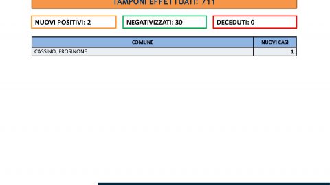 FROSINONE – 06 GIU – Nelle ultime 24h sono stati effettuati 711 tamponi.Abbiamo registrato due nuovi casi di positrivi al