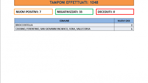Nelle ultime 24h sono stati effettuati 1048 tamponi. Abbiamo registrato 7 nuovi casi di positivi al Sars-CoV-2. L’indice è allo