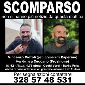 Ore di apprensione a Ceccano per la scomparsa nel nulla di un militare dell’esercito di 42 anni, Vincenzo Ciotoli: di lui non si hanno più notizie da venerdì mattina. È stato visto l’ultima volta a bordo di una Fiat Punto. Indossava un giubbotto marrone e un foulard.