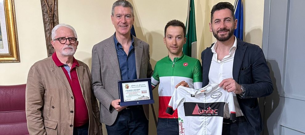 Il ceccanese Giuseppe Carcasole dell’Asd Unitec Cycling Team è il nuovo campione Italiano Mediofondo 2023 per la categoria “Master 2”. La consegna della targa si è tenuta a Palazzo Antonelli da parte del delegato allo sport Diego Bruni e del sindaco Roberto Caligiore.