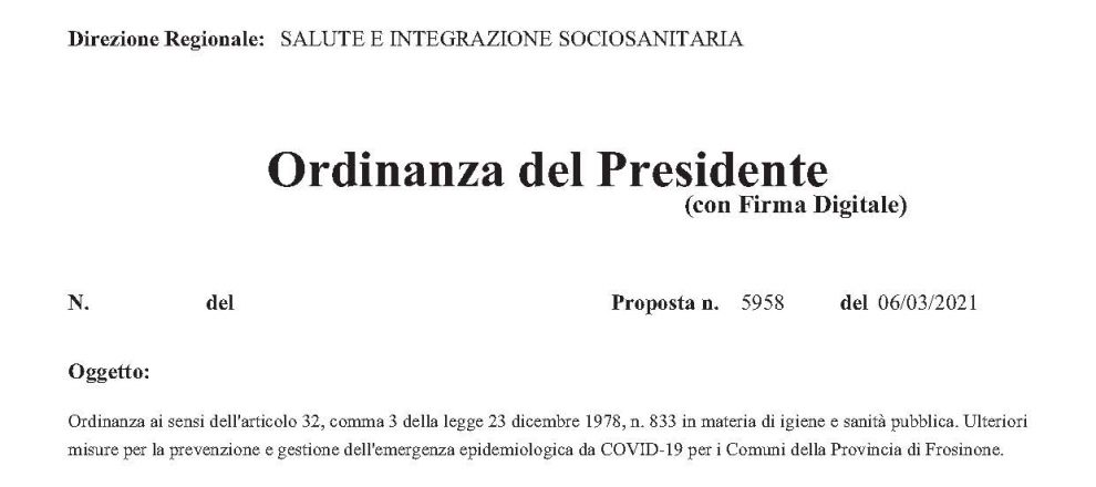La provincia di Frosinone dall’una della notte di lunedì sarà in zona rossa per 14 giorni. L’ordinanza l’ha firmata il governatore Nicola Zingaretti.