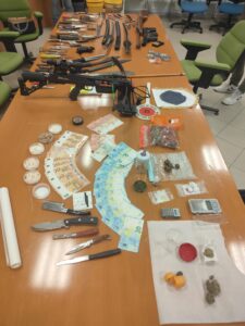 Nell’appartamento vive anche il padre, trovato in possesso di circa 3 grammi di cocaina e di numerose armi: tre pistole a salve prive del tappo rosso, quindi facilmente scambiabili per armi vere, un fucile ad aria compressa, coltelli a serramanico, pugnali, coltelli a farfalla e un dissuasore elettrico vietato.