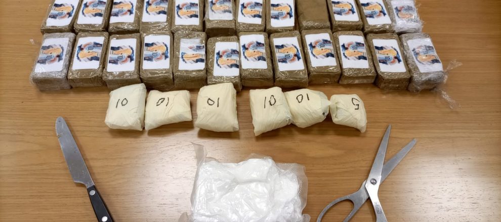 L’uomo, quando si è visto scoperto, ha tentato di fuggire ma, dopo una breve colluttazione, è stato bloccato dagli agenti. All’interno della valigia sono stati rinvenuti 4,7 kg di hashish, 350 grammi di cocaina, un coltello da cucina e una forbice utilizzata per il taglio della sostanza stupefacente, oltre a materiale per la pesatura e il confezionamento.