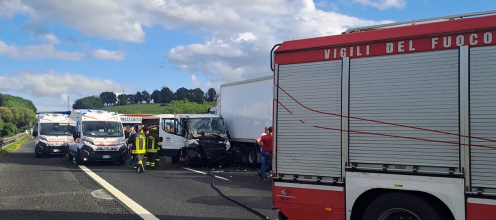 Incidente stradale nel pomeriggio in A1 tra i caselli di Anagni e Colleferro in direzione nord. Qui, per cause al vaglio della Polizia, un autoarticolato si è intraversato, invertendo di fatto il senso di marcia ed un furgone che lo seguiva lo ha centrato in pieno. All’interno del furgone erano presenti alcuni operai edili, subito soccorsi dai sanitari del 118, arrivati con quattro ambulanze. Due di loro, di cui uno rimasto incastrato, hanno riportato le ferite più serie, ma la loro vita non è in pericolo. Sul posto, oltre al 118, anche i vigili del fuoco di Fiuggi e la polizia stradale, con una pattuglia della finanza che era lì di passaggio a supporto. Lunghissime le code, che hanno toccato anche i sei chilometri tra i caselli di Ferentino e Colleferro.