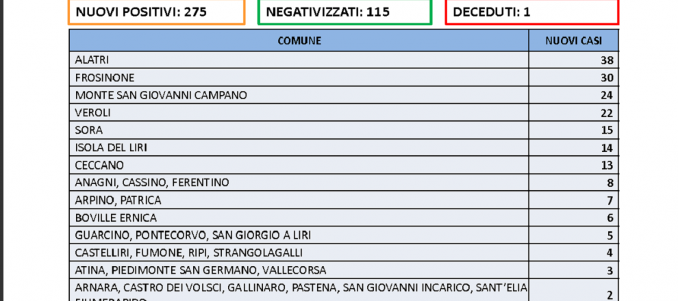 A Sora ve ne sono 15, ad Isola del Liri 14:, a Ceccano, 13. Sono 52 i comuni della Provincia di Frosinone interessati dai contagi di giornata.