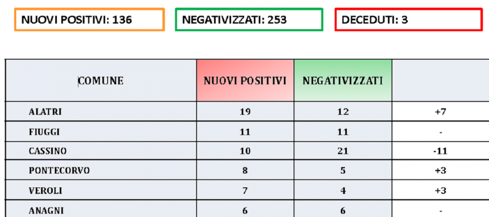 Per quanto riguarda i casi di giornata sono 19 i positivi ad Alatri. 11 a Fiuggi, 10 a Cassino dove ci sono, però, ben 21 guariti. Boom di guariti anche a Sora: ben 20 a fronte di 6 nuovi positivi.