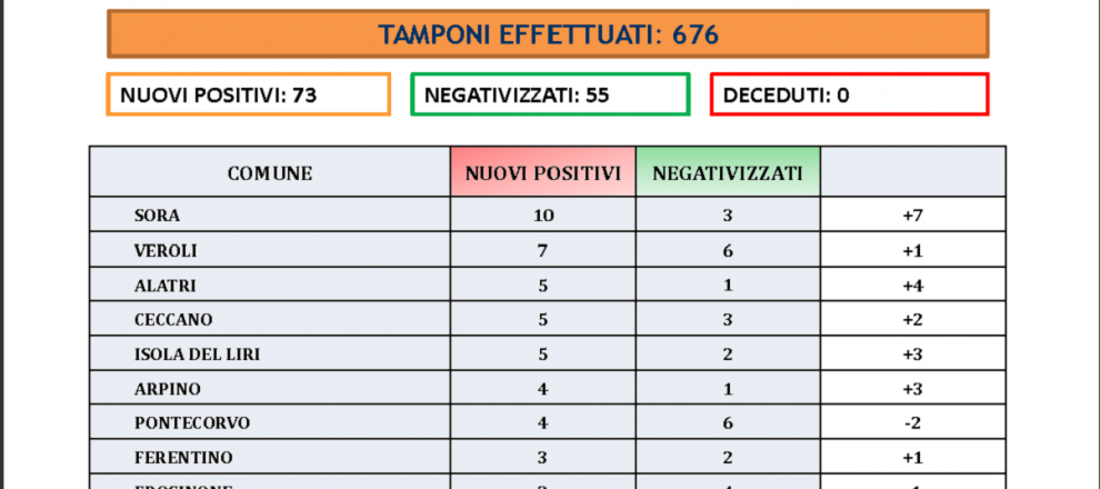 Sono 73 i nuovi positivi al Covid in Ciociaria: i tamponi processati sono stati 676. Il rapporto è al 10,7%.