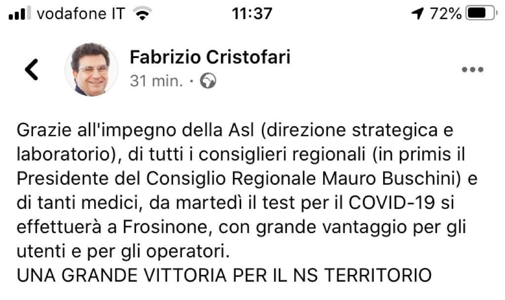Anche al S. Benedetto di Alatri e al Ss. Trinità di Sora sabato mattina sono state montate le tende per il pre -triage. Da martedì, invece, i tamponi si potranno fare direttamente allo Spaziani di Frosinone con un grande vantaggio per cittadini ed operatori sanitari. Ad annunciarlo nelle scorse su Facebook il presidente dell’Ordine dei Medici, Fabrizio Cristofari, che ha sottolineato come il tutto sia stato possibile grazie all’impegno di Asl e Regione.
