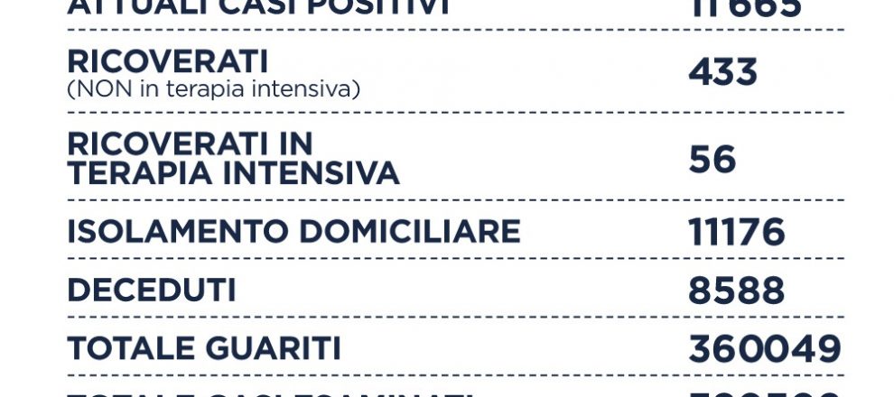 Sono 3 i decessi (-3), 433 i ricoverati (-6), 56 le terapie intensive (-3) e 488 i guariti. Il rapporto tra positivi e tamponi è a 1,1%.