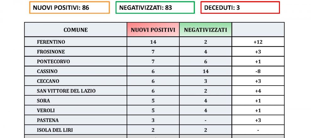 Sono 86 i nuovi positivi al Covid nelle ultime 24 ore su 775 tamponi effettuati. L’indice di positività continua a salire e si attesta all’11% in Ciociaria. Le vittime censite sono 4: un uomo di 62 anni residente a Sora, una donna di 67 anni residente a Roccasecca e un uomo di 76 anni residente ad Aquino. A questi si aggiunge un uomo di 85 anni residente a Fondi. Sono 40 i comuni in cui sono stati conteggiati i nuovi casi: Ferentino in testa con 14 positivi; poi Frosinone e Pontecorvo con 7, Cassino, Ceccano e San Vittore con 6. I guariti sono 83.