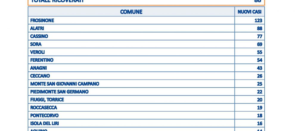 Covid – Anche oggi oltre i 1000 casi in provincia di Frosinone, muore un 87enne di Alatri con patologie pregresse