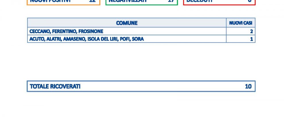 17 i negativizzati. Scendono a 10 i pazienti ricoverati in provincia di Frosinone per covid .