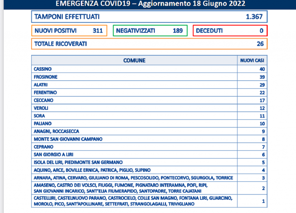 Contagi ancora oltre quota 300 in Ciociaria. Sono 311, per la precisione, i positivi al Covid su 1367 tamponi. Scende leggermente il tasso che si attesta al 22, 7 per cento. I guariti sono 189. I ricoverati 26, uno in più della precedente rilevazione.