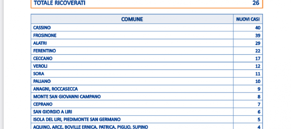 Frosinone è a quota 39. Alatri ne conta 29, Ferentino 22, Ceccano 17. Veroli 12, Sora 11, Paliano 10.