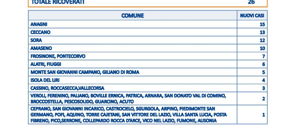 Effetto lunedì: Zero decessi in provincia di Frosinone dove ci sono 140 nuovi positivi su 517 tamponi. Il tasso di positività è al 27%. 42 i guariti, 26 i ricoverati.