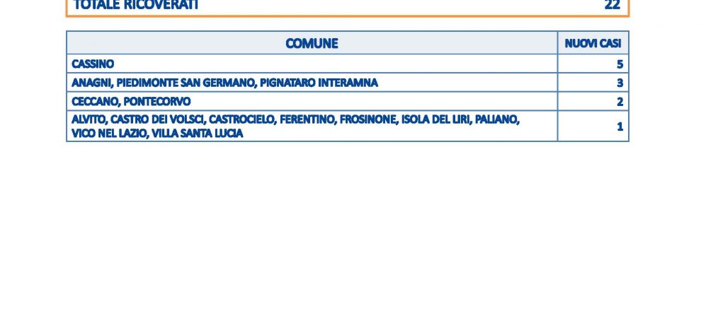 FROSINONE – 13 GIU – Il solito effetto lunedì causa i pochi tamponi processati vede registrati solo 27 nuovi casi covid in provincia di Frosinone. Non risultano decessi, i guariti sono 25, 22 i ricoverati. Cassino registra il maggior numero di contagi con 5, 3 ad Anagni, Piedimonte, e Pignataro. Sono 2 i casi per Ceccano e Pontecorvo, un caso a Castro dei Volsci, Castrocielo, Ferentino, Frosinone, Paliano, Isola del Liri,Vico nel Lazio e Villa Santa Lucia.